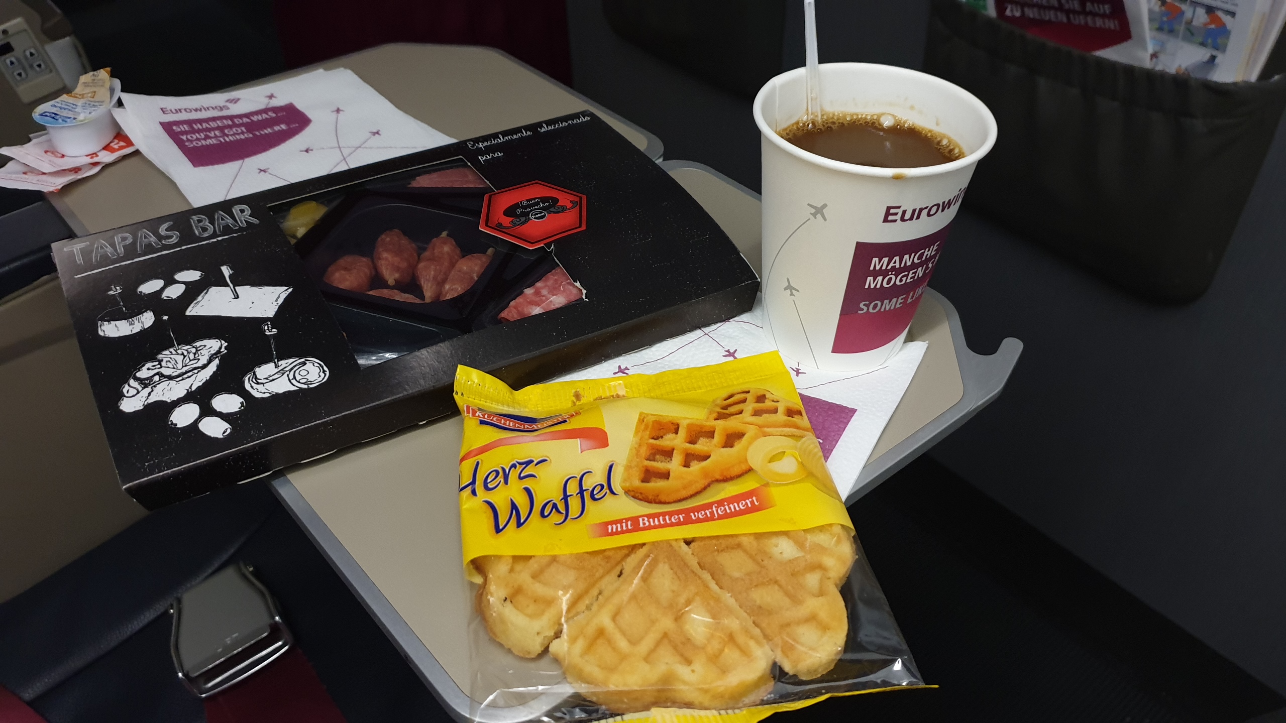 Within 10 minutes of take-off, the cabin crew started the on-board service and I got my first experience of European business class A-la-Carte dining. To be completely honest, I was slightly underwhelmed as this is reality meant I had a choice of anything of the in-flight menu, and there was nothing specifically for Business class passengers. I chose to have the Tapas and a waffle, both of which were pleasant, but neither were exceptional. Whilst I wouldn’t usually drink coffee this late in the day, with my energy flagging and at least an hour’s drive home I had another cup of the very pleasant but strong coffee served by Eurowings. Incidentally I have a rule that I don’t drink tea on aircraft as tea is designed to be me made with the water at, or extremely close to, 100 degrees centigrade, however due to the air pressure water boils at nearer 90 on aircraft. This unfortunately can make tea taste not particularly great and so I tend to choose coffee or soft drinks when flying.