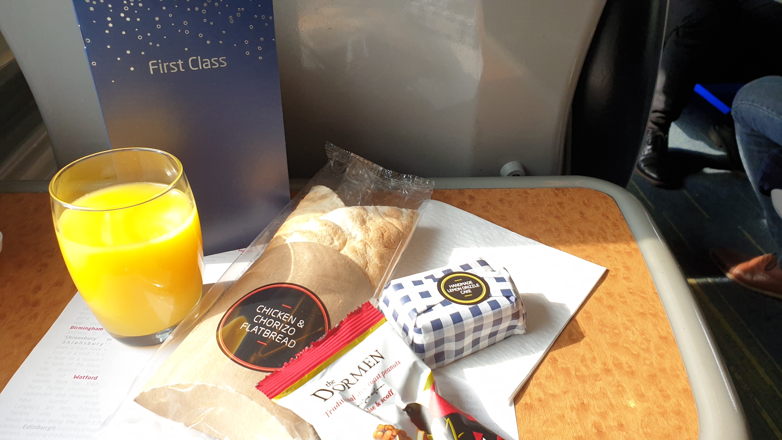 Soon after departure from Euston a drinks service was undertaken with the usual choice of tea, coffee, soft and alcoholic drinks. With a coffee to give me some energy and an orange juice, I was able to get 20 minutes of writing in before our approach to Milton Keynes Central signalled the start of the food service. When travelling in first class in the UK, I tend to choose the single seat side of the aisle and one of the individual tables to ensure some personal space and relative privacy if I desire it. Unfortunately, the compromise I make in taking these seats is that there is not space on the table for a laptop, drinks and food and so the food service generally means the end of work time. The other compromise is the lack of quiet carriages, which can unfortunately mean a noisy journey if other passengers are on their phones. I believe the only Train Operating Company that until recently had quiet coaches in first class was Virgin Trains East Coast (now LNER), however these were dispensed of in early 2017.