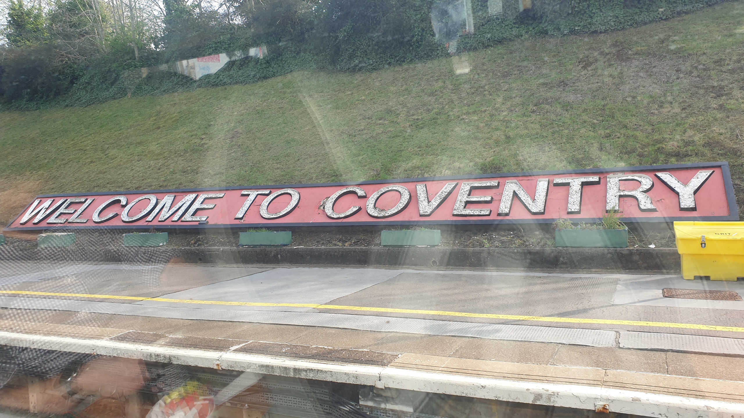 Finishing my lunch just as we arrived at Coventry, and with just over 20 minutes left of the journey, I decided against trying to get any more writing done and chose just to enjoy the view out of the window. Coventry station has a large ‘Welcome to Coventry’ sign on one of the platforms and efforts have clearly been made to try and make the station welcoming with the sign being on a grass bank with a number of planters along the bottom. Unfortunately, this work has been slightly detracted from by the bright yellow salt bin that has been placed next to the final planter.