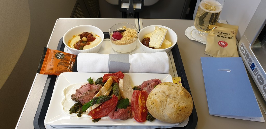Shortly after passing the coast of Normandy the crew had finished the drinks service and came around the cabin again to take food orders and, as with the drinks, deliver these prior to moving onto the next pair of seats. Whilst this method took longer to serve everyone, it did make the service feel more personal and enhanced the Club Europe experience (for me at least). There was a choice of three different main courses on offer on this flight: a British roast chicken supreme with sweetcorn mash and vegetables; a vegetable korma with rice; and my option roasted Scottish beef, grilled chicken, cream cheese and pesto. All three options came with a hummus starter, a cheesecake bowl dessert and a mini cheese board. I found my beef option to be delicious, with the meat having been cooked just the right amount before being chilled and the pesto having a lovely flavour.