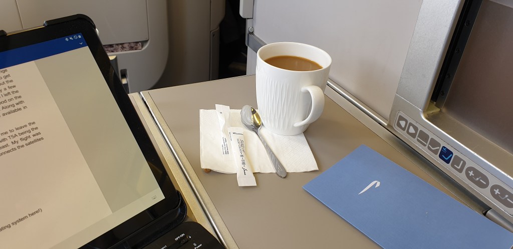 After lunch was finished and cleared away, I decided to get some work done and so settled in with some music from the IFE to write some blogs. Setting up the music to play on the IFE was fairly straightforward with the touchscreen being sufficiently responsive that I didn’t need to use the remote. The IFE also had a good inflight map and so I set this up to display whilst the music played in the background, allowing me to keep an eye on our journey whilst doing some work. One slight issue I found with the seat, and more specifically the tray table, was that whilst large enough to work it wasn’t particularly stable, causing it to bounce as I typed on my tablet. Whilst this effect was minimised the closer I moved my tablet to the join of the table, it did limit the useful space available.