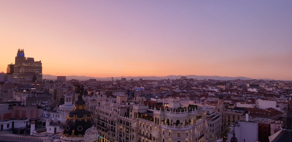 After relaxing in Retiro for a while, I wandered back towards the city centre heading for the Círculo de Bellas Artes (CBA) and it’s rooftop bar. This place was a recommendation I’d picked up from Time Out magazine online and decided to time my visit to watch my final sunset in Madrid. I’d also arranged to meet up with a fellow traveller and blogger, Becks, who’s blog ‘Its Just Becks’ had helped inspire my visit to the Spanish capital. Becks has been to Spain countless times so check out her blog and social media (Facebook, Instagram & Twitter) for some top tips and hidden gems!