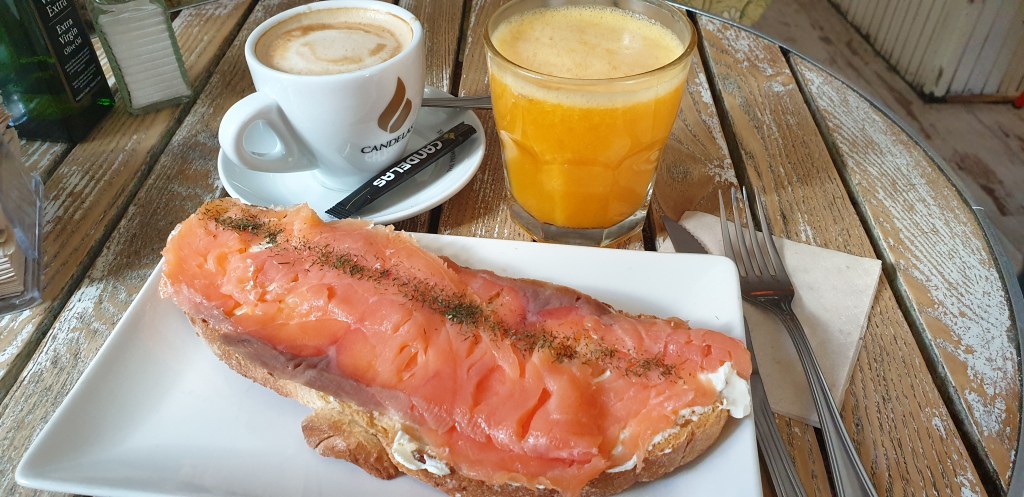 Not needing to be at the airport until about 1 in the afternoon, I decided to have a relaxed final morning in Madrid and after checking out of my room, took a stroll to a café a couple of streets away which I had read was a great place to sit and write. Café de la Luz is just two streets from Gran Via, however is a world away from the chaos of Madrid’s main shopping street. The café has been made to feel like a cosy living room, with large comfortable armchairs to relax in, whilst their brunch deal is a bargain and includes coffee, juice, a very filling slice of toast with topping (think Salmon and dill, not marmalade!) and a piece of cake!