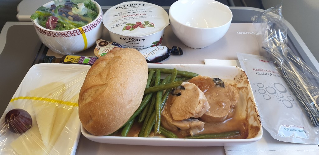 The menus had been distributed just before departure and the choice of mains was either grilled chicken breast with apricot and black olive, served with a creamy sherry sauce and green beans or salmon stuffed pasta with a cava cream sauce and sundried tomatoes. Both choices came with a standard starter of peppers, golden raisins and pine nut salad and a desert of sheep’s milk cheese and a raspberry yoghurt. My choice of the chicken was absolutely delicious with the meat not being too dry and cooked just right, something which can be quite difficult on an aircraft.
