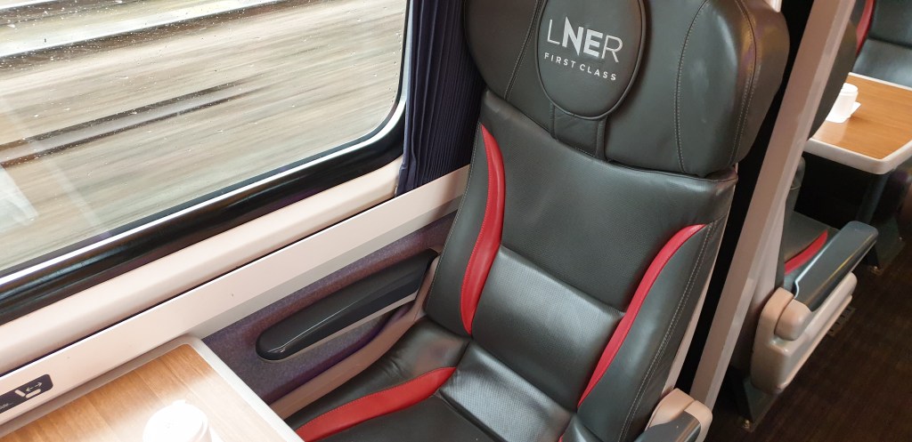 Our reservation was for coach L, however upon boarding I was disappointed to find that my reserved seat was broken and more like a rocking chair than a first-class seat. Fortunately, although this train is heavily reserved, there were plenty of seats booked for journeys starting beyond York and so we moved to coach M and my commandeered seat of M11. LNER’s first class coaches are laid out in a 1-2 configuration meaning the individual seats on one side have both a window view and aisle access.