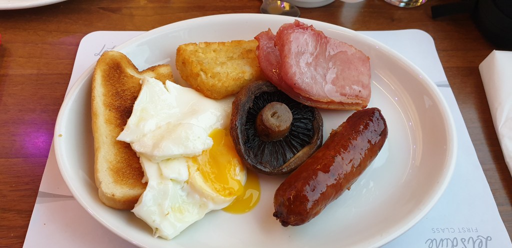 Shortly after departure from Grantham and only 15-20 minutes after ordering our breakfast was brought to us from the on-board kitchen and train food has never looked so appetising! LNER are proud to source their on-board offering from suppliers along their routes and the Taste Tradition rare breed sausage and Yorkshire bacon were extremely delicious. Accompanied by a fried egg, slice of toast, hash brown, mushroom and the option of baked beans, the Full LNER definitely filled a hole and helped wake us up.