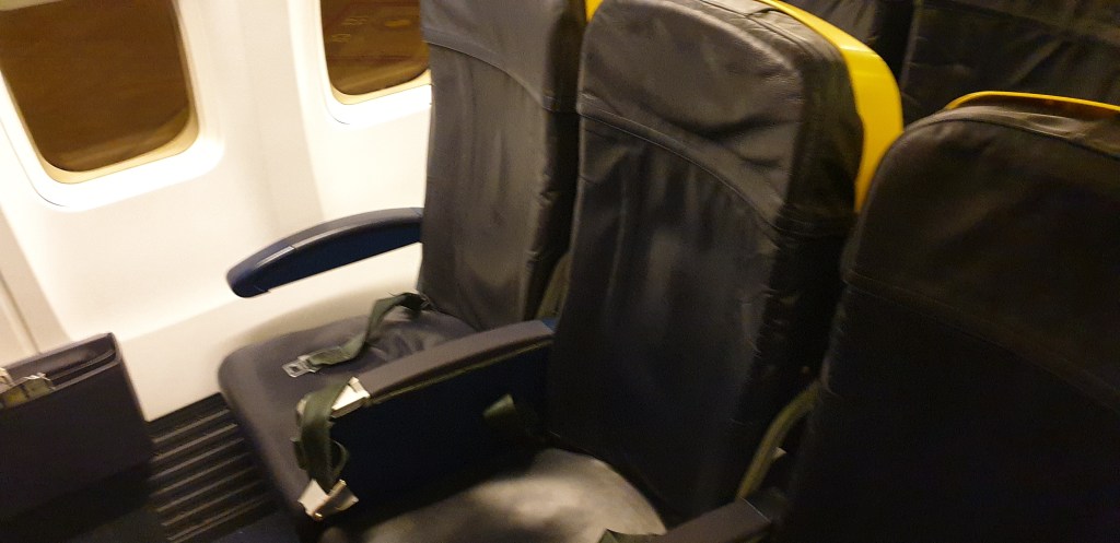 In the end there were very few people with priority boarding as so I was about the sixth person to board the aircraft via the front steps. Taking my place in seat 2F, I found that this was one of Ryanair’s older interiors and so was glad to have purchased extra legroom as I’ve found in the past that the standard legroom isn’t enough for my knees in this cabin. Unfortunately, as I settled in I found that due to the fixed armrests containing the tray tables, the extra legroom seats are narrower than a standard seat and so the short flight back to Birmingham was rather uncomfortable.