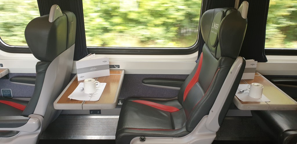 As mentioned in previous blogs, there isn’t a first-class lounge available at Peterborough and so after arriving at Peterborough about 20 minutes before my train I headed straight to the platform. Upon looking at the screens, I was slightly confused as coach J, the location of my reserved seat, was not showing, however a quick tweet to LNER confirmed a ‘set swap’ meaning my booked HST set was now being operated by a class 91 electric train and my reservation would now be in coach K. With the train arriving a couple of minutes early I was pleased to find the train was extremely quiet with only myself and three other passengers in coach K.
