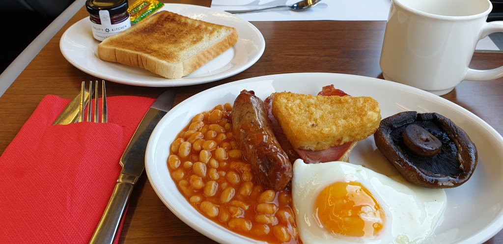 After a cheerful welcome from the on-board crew, I quickly found my seat and settled in for the relatively short journey north. Within a minute of the train departing Peterborough, a member of the crew came through the carriage and took my breakfast order from a choice of a ‘Full LNER’, avocado on toast, a bacon roll, porridge or a ‘Light Breakfast’. As always, I chose the Full LNER and was surprised that within five minutes this had been served.
