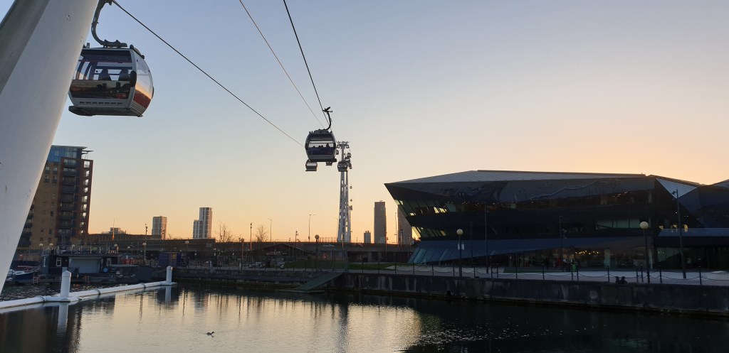 I’d been in North Greenwich for the afternoon for work and having had 15 minutes to sit by the river, I’d watched the gondolas of the Airline pass across this rejuvenated stretch of the Thames. When I’d finished for the day, I decided to treat myself and rather than take my standard route via the Jubilee line to Stratford, took the Air Line across the river and then the DLR up to Stratford.