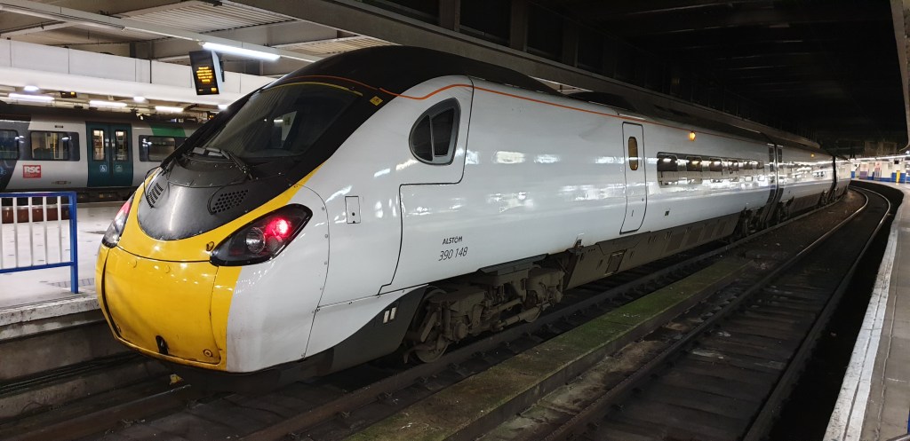 About 15 minutes before departure, boarding was announced, and I headed down to Euston’s gloomy platforms and the awaiting Class 390 Pendolino (390148). Due to the recent change in operator most of Avanti’s trains are in an all-white, brand-less livery, with my train being no exception to this. Avanti do have one train in their new livery, a smart mix of dark green and white, and I look forward to seeing more trains carrying this across the west coast in the future.