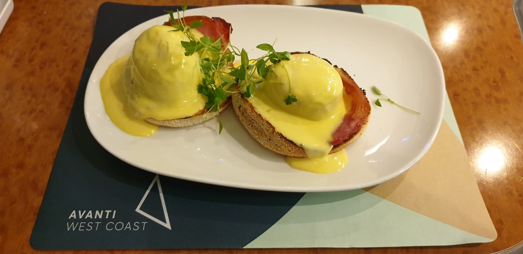 We departed Euston’s platform six exactly on time at 06:43 and began to weave our way through north-west London and our first stop, Milton Keynes. Less than five minutes after departure the on-board crew came through taking breakfast orders and serving drinks, offering a choice of tea and coffee as well as juice and water. I was pleased to see that Avanti haven’t yet made any major changes to the menu, and the Great British Breakfast still include black pudding, however on this trip I decided to opt for the Eggs Benedict.