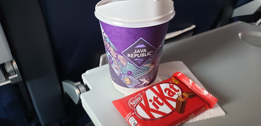 Given the length of the flight I was quite impressed with the offering from the trolley with a wide range of drinks and snacks being available including sandwiches and a ‘full Irish breakfast’. I opted for the coffee and chocolate meal deal which got me a decent Java Republic coffee and a KitKat for €4.50 or £3.90 when I paid in pounds.