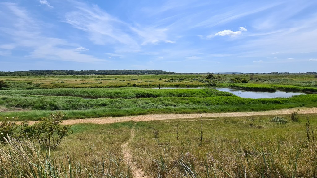 At the back of the beach, a line of dunes protects this part of Norfolk from the sea and we opted to walk back along the top of these to see how the view differed. Having to walk slightly further north than planned to climb up to them, due to nesting birds along one part, as we reached the top we were surprised to find an oasis of greenery around a lake sitting right behind the line of dunes.