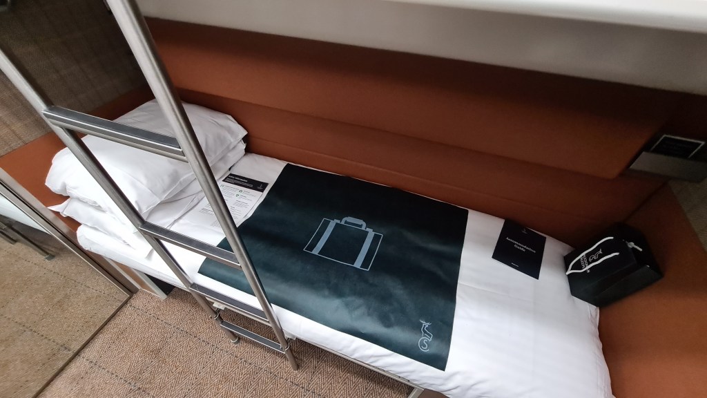The first thing I noticed inside the room was how much space there was despite being on a train. Even with my bag taking up a decent amount of space on the floor, I was still able to move around easily and the with the ensuite toilet/shower being a wet room, the space for showering was more than in many hotels. I was disappointed to find that the room was set up as a twin room, despite me booking as a solo occupancy a month in advance. Whilst not the end of the world, it does mean the top bunk is set up which reduces the space when on the bottom. Caledonian Sleeper do advise if you book less than 24 hours in advance that both bunks will be set up, so I assume the fact my room was moved relates to this.