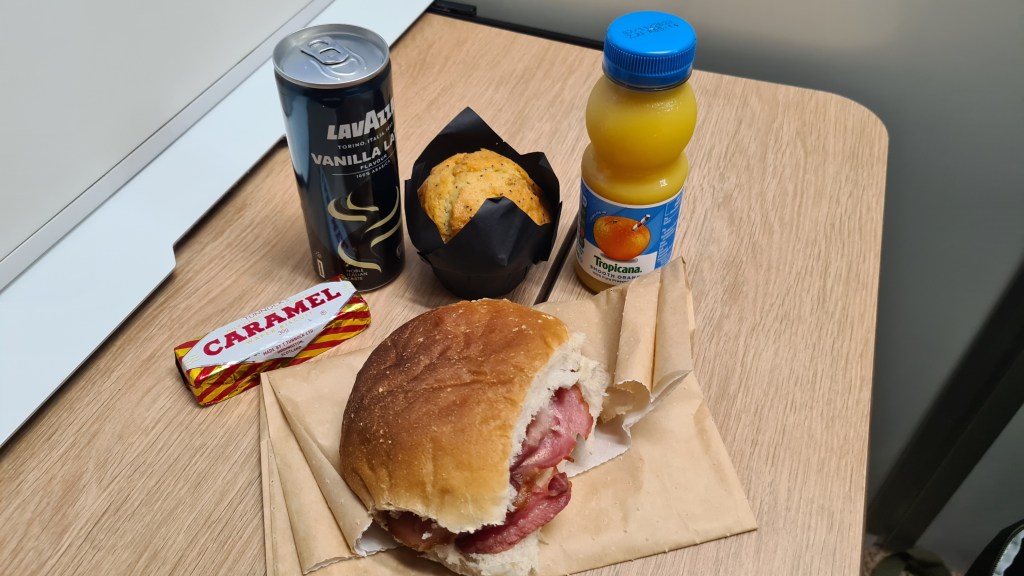 Due to Covid, breakfast was scaled down and consisted of a muffin (American style not English), an overcooked bacon roll and an orange juice, supplemented by a Tunnocks Caramel wafer and canned cold coffee that I brought with me.