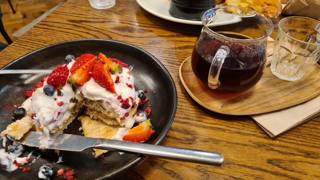 I opted for pancakes with fruit and a ‘hand brew’ coffee and my dish arrived piled with four pancakes and more than enough fruit to fill me for the morning, whilst the coffee was just what I needed to get going. BEAR was also reasonably priced for a city centre restaurant with all the dishes on their brunch menu costing £9 or less. All in all, with drinks, our meal came to about £25.