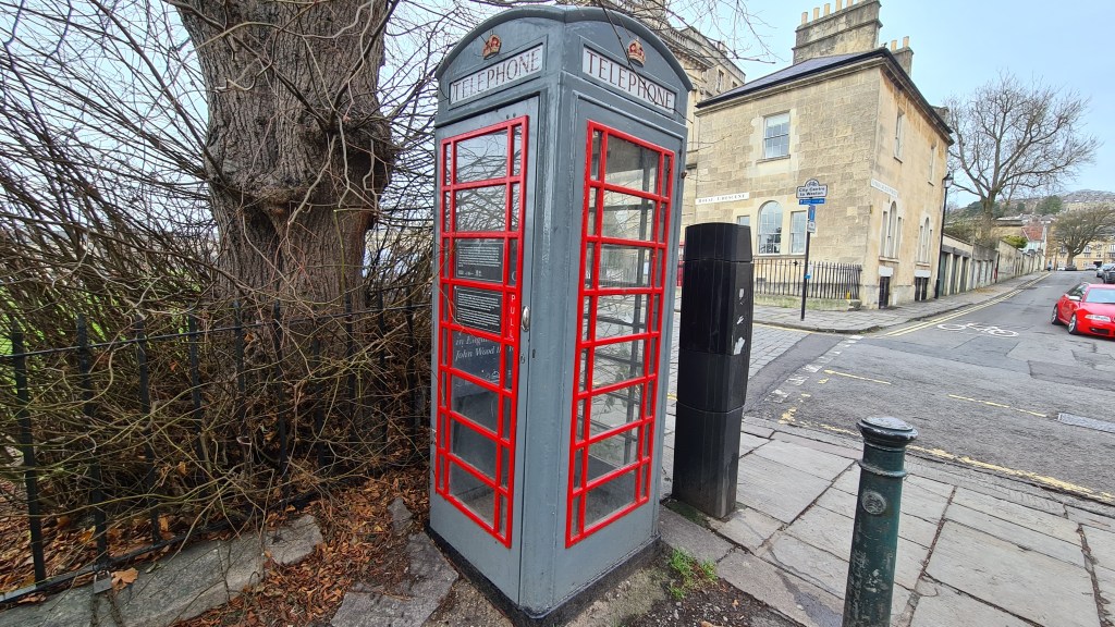 Whilst almost two-thirds of the crescent’s townhouses have now been split into flats, 10 remain full size townhouses, whilst No. 1 Royal Crescent is a museum and the large central house at No. 16 is The Royal Crescent Hotel. We did attempt to have a look around the museum but unfortunately it was fully booked for the day. However, we did find another piece of history close to the museum, a strangely painted ‘K0’ telephone kiosk.