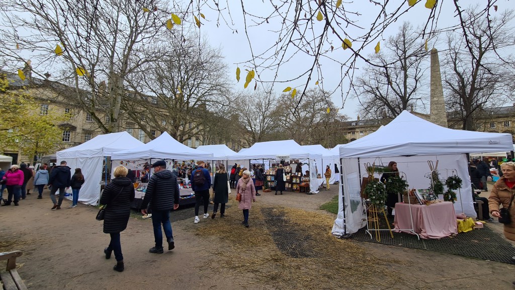 Following the obligatory photo taking and an impromptu lesson on the history of telephone boxes, we began to descend the hill back towards the city centre. Part way is Queen Square which was hosting an Artisan Market and, under the belief that Bath’s main Christmas Markets had all been cancelled, decided to make the most of it and spend some time looking around. The market had a wide range of craft items, food and drink and we left with some very nice caramel rum, a chimney cake, fudge and a couple of final Christmas presents.