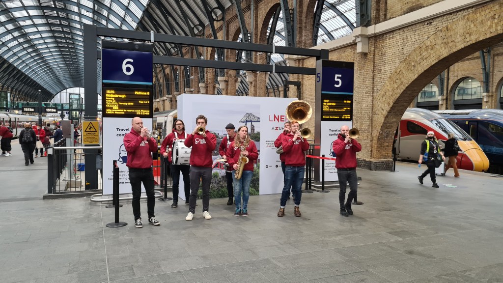 With the lounge being rather underwhelming I headed down to the platforms early to see if there were any events going on as part of the inaugural service. Although the speeches all seemed to have occurred in Middlesbrough in the morning, there was Back Chat Brass, an Octet of musicians who provided entertainment as we boarded the train. On the platform there were also a number on LNER staff handing out goodie bags containing a pen, Azuma branded water bottle and a poster celebrating the Middlesbrough launch. The train for our journey north was 800202, with bi-mode five-car Azuma’s operating the route due to the fact the route north of Northallerton is unelectrified.