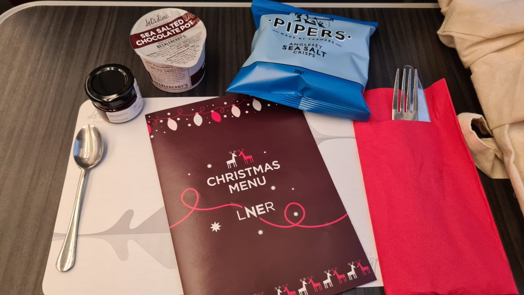 When booking this trip back in October I had been hopeful that LNER’s new ‘Dish’ menu would have been launched in first-class, given their assurances it would “be by the end of the year”. However, when the menus were distributed, I was slightly disappointed to discover that, whilst different to the normal ‘Deli’ menu, this was an interim Christmas menu and not the ‘coming soon’ ‘Dish’ menu.