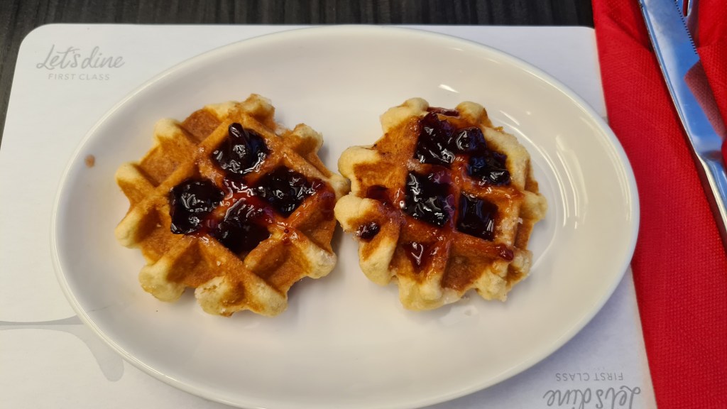 Despite my disappointment at this not being the new menu, the interim Christmas menu did provide some better options than what had become standard, including Waffles with a choice of plum & port jam; maple ‘flavour’ syrup; or Nutella. Opting for the jam accompaniment, it wasn’t long before these were delivered and I’ve got to say, for train food, they were delicious! There was also various snacks available and so I accompanied my late lunch with a chocolate pot and a packet of crisps.