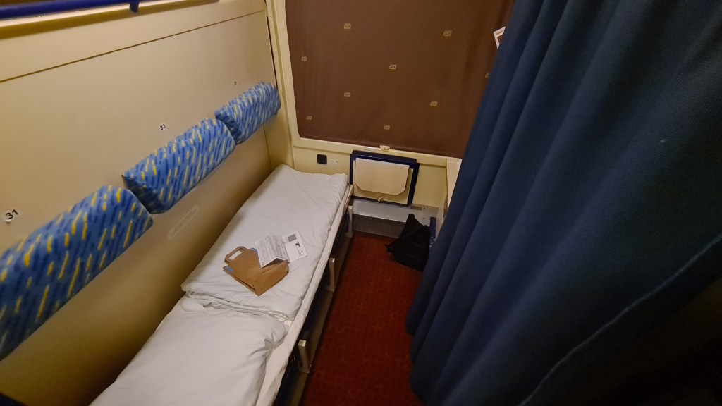 In terms of accommodation, each compartments in the sleeping car can accommodate up to three people, with the bunks folding up dependent on how many people have booked. As a solo traveller, you can choose to share with one or two strangers or pay extra and book a compartment to yourself. Given Covid, and that this was my first time on a European sleeper, I decided to pay the premium and have the compartment to myself.