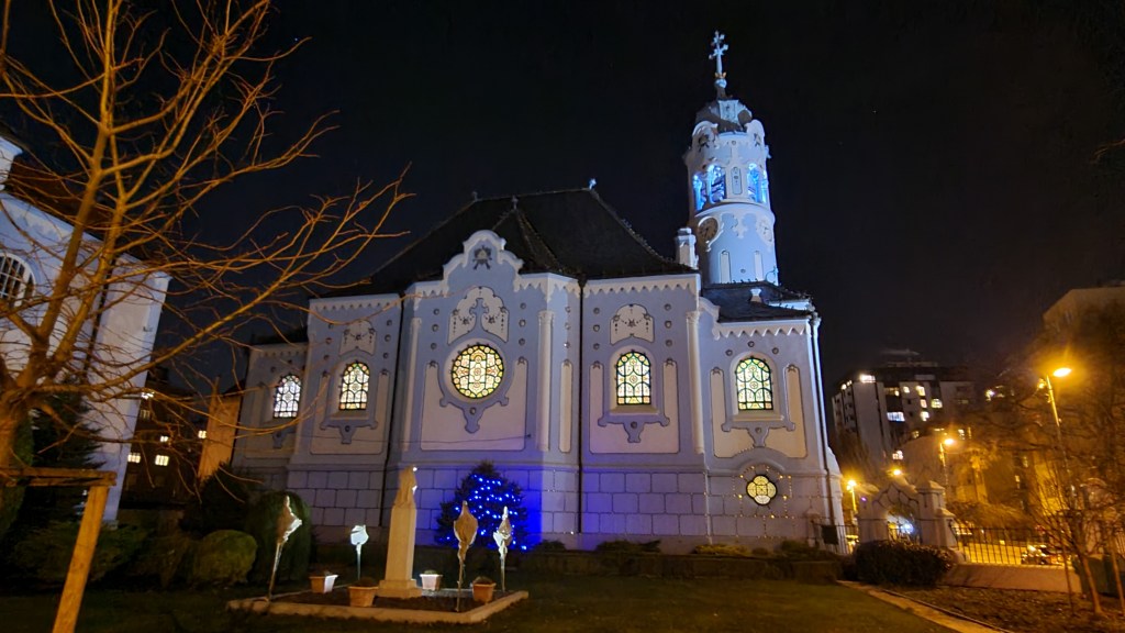 Having had a relatively late lunch and early dinner, I was almost rolling back along the embankment to the tram stop to take me to my final destination of the day, The Church of St. Elizabeth, commonly known as The Blue Church. With a blue façade, mosaics and a blue-glazed roof, the church is absolutely stunning and whilst I didn’t head inside due to a service taking place, the site of it illuminated in the surrounding darkness was just jaw-dropping.
