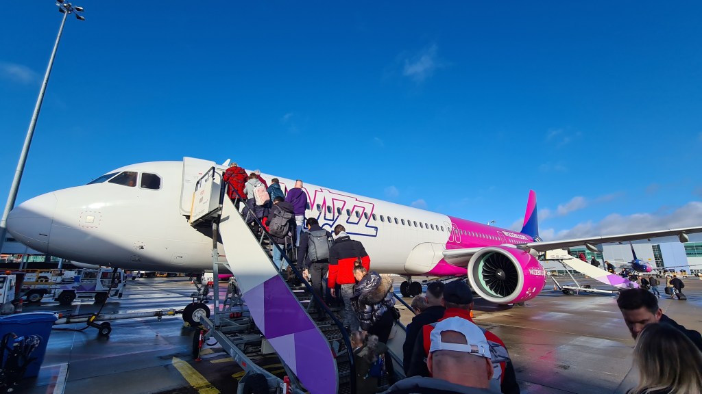 Having had my fill of coffee and buffet breakfast, and recharging my phone ahead of a long day of exploring, it was time to head to the gate with a bit of a walk out to pier that’s home to gates 30-43. As with all low cost carriers (LCCs), Wizz has standard and priority boarding and so the gate was split into to queues. Whilst I had spent a bit extra to reserve a specific seat, I hadn’t paid for priority boarding and was quite glad as seemingly half the aircraft had paid for the privilege, removing most of the benefit.