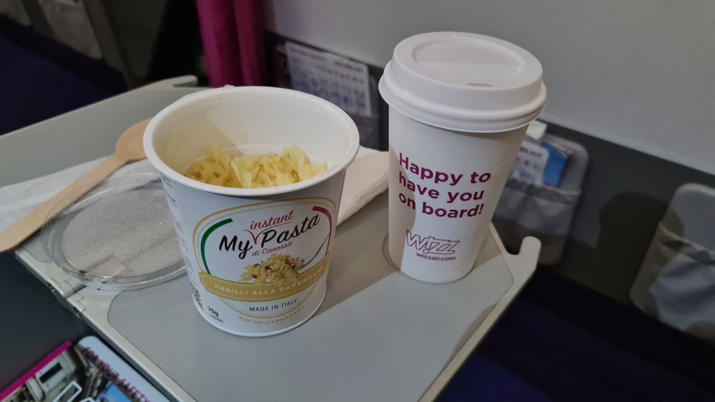 Oddly, despite me using my Monzo bank card on the flight out, the crew on this flight told me they didn’t accept Monzo because the cards don’t work on their machines. With my coffee, croissant and pot of pasta costing 43 zloty, I thankfully had just enough change left to cover this, but I did find it frustrating, especially given the rather blunt manner in which the flight attendant told me. Looking online, it seems this is a hangover from when Monzo cards were pre-paid and as such was incorrect information.
