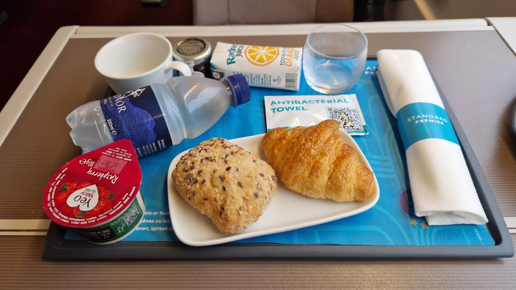 Just before reaching the tunnel, breakfast was served, with a continental breakfast being included for Standard Premier passengers. This consisted of a croissant, a bread roll with jam, a raspberry yogurt and a carton of orange juice. Tea and coffee was also offered at this point, with this on almost constant supply for the rest of the journey.
