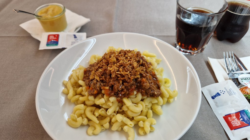 Opting for a dish of pasta with mince and onion, along with coke from a glass bottle (the best kind), I enjoyed the last of the scenery passing by before we entered the tunnel. Whilst there was a wide-range of menu options, it seems that these have been chosen for their ability to be cooked relatively quickly and within about 10-minutes of ordering I was having my food delivered. Despite being quick to cook, my meal was absolutely delicious and better than some restaurants I’ve eaten in on my travels. It was certainly as good as, if not better, than the excellent meal I had onboard Czech Railways from Bratislava to Prague (read about that here).