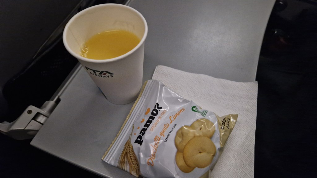 Shortly after departure I was surprised to find a free drink and snack being handed out. ITA Airways seems to be one of the few remaining ‘full-service’ airlines that do this and its especially rare since Covid. What makes it even more surprising is the financial difficulties faced by ITA Airways predecessor, and I’d have thought the free drink and snack would have been the first to go during any cost cutting. Nonetheless it was a welcome surprise.
