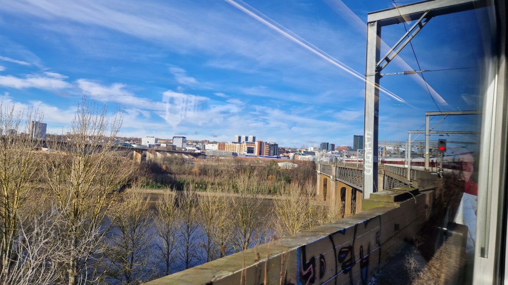 The stops at Darlington and Durham were uneventful and we were unfortunately on the wrong side of the train to properly enjoy the view of Durham Castle and Cathedral. As we approached Newcastle we passed Tyne Yard which sits on the west side of the ECML and from where engineering trains for works in the north-east depart. Network Rail have multiple yards dotted around the country to deliver engineering works, from Hoo Junction in Kent to Millerhill near Edinburgh.