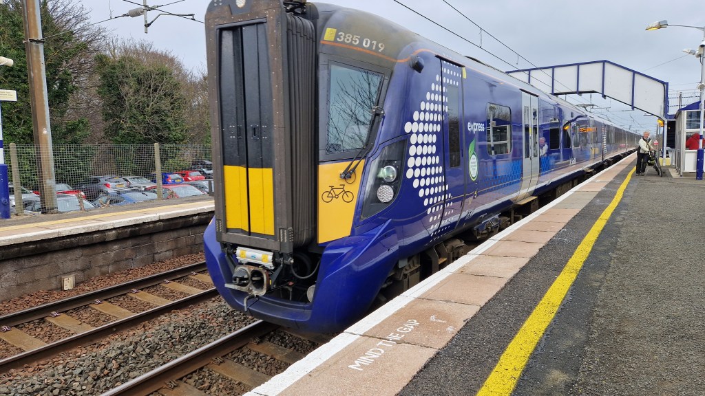All three stations in this episode are served by the hourly ScotRail service between Edinburgh Waverley and North Berwick, usually operated by a pair of either class 380s or class 385s. These are nice modern trains with WiFi, power sockets and a mix of ‘airline style’ and table seating. However, with the longest journey on this route being 34 minutes, most trips are just short hops.