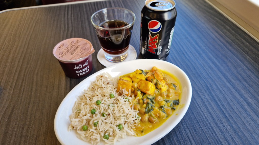 LNER services have one of three first class menus, ‘Deli’, ‘Dish’, and ‘Dine’, with this service being advertised in their timetable as a ‘Dish’ service. After issues with crewing and hot food on previous LNER services, I was pleasantly surprised to find that the menu was being delivered on this service. Despite this service being a 1030 departure from London the lunch menu was being served so I decided to go for the creamy coconut, sweet potato and paneer curry which I had missed out on on our journey back from Scotland (read about that here).