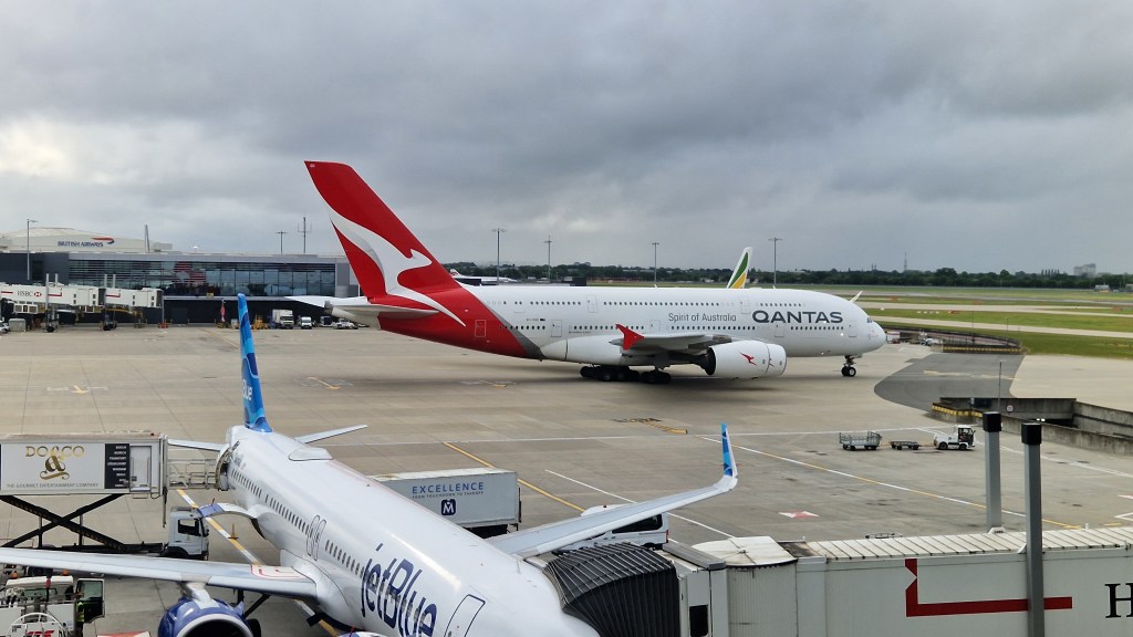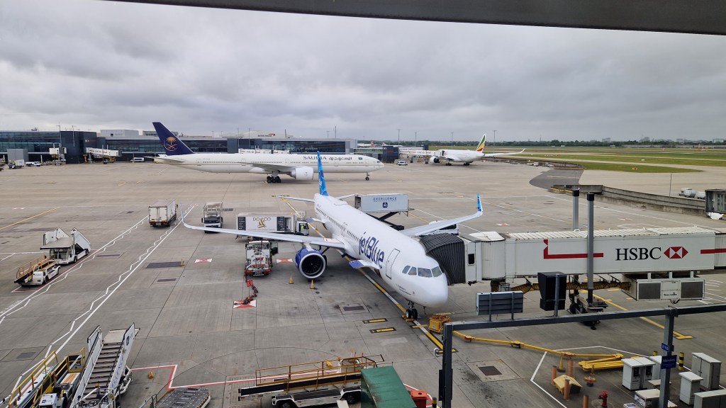 A highlight of my time spotting was the pair of JetBlue Airbus A321neos which were being prepared for departures to Boston Logan and New York JFK. There was also plenty of other interesting aircraft and airlines around including Saudia, Qantas and Ethiopian Airlines, with the Airbus A350 belonging to the latter being moved over to the remote stands to await its evening departure back to Addis Abba.