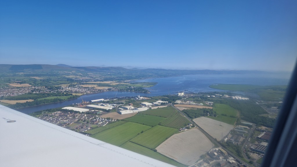 A quick turn after departure and we were initially heading north until we were around Luton before another turn had us flying north-west. Passing over Northampton, Derby and southern Manchester, we crossed the coast over the Lancashire town of Southport before overflying the Isle of Man. Crossing over the Northern Irish coast to the south-east of Belfast, the sea of clouds began to clear and we got some great views of Northern Ireland’s stunning scenery.
