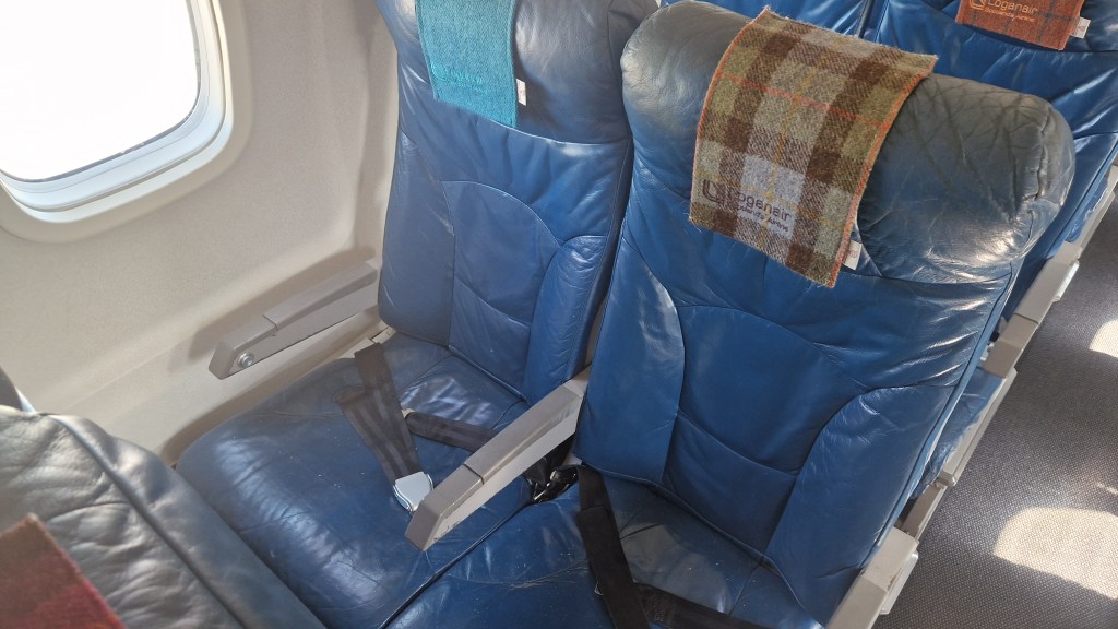 Loganair have their ERJ145s configured to carry 49 passengers in an all-economy cabin, with seats arranged in a 1-2 config either side of the aisle. Compared to the economy seating on most short-haul flights, I was impressed with the amount of legroom provided onboard although the narrower cabin did mean the seats appeared to be narrower than normal. With just 24 of the 49 seats filled, there was plenty of space onboard, although everyone with a wheeled cabin bag had been required to have these put in the hold for the flight as the overhead lockers are quote small.