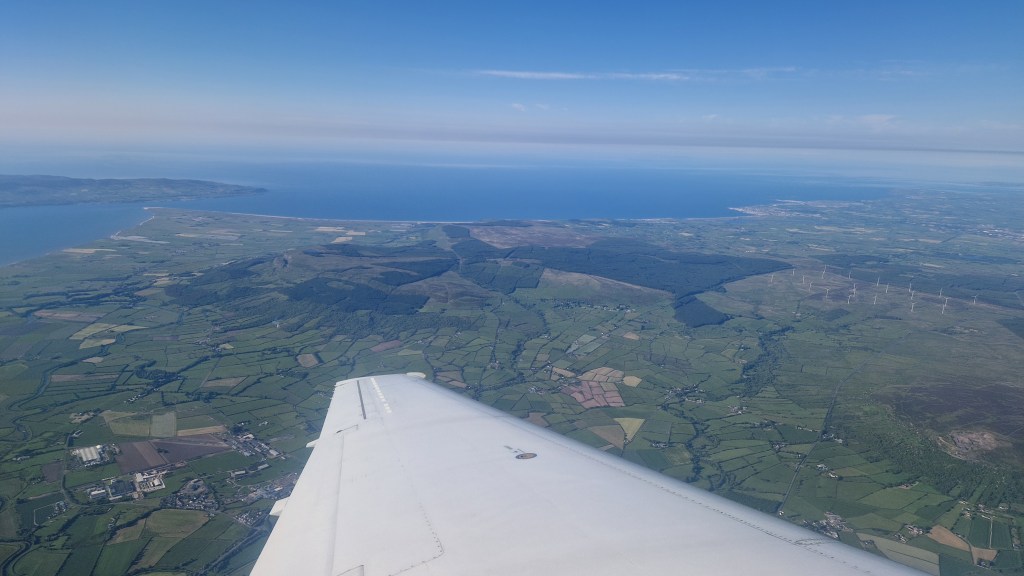 We departed our stand via a tight turn at 1821 and following a taxi and backtrack down the runway, we took off at 1827 from runway 08 and we immediately heading out over Loch Foyle. From there we headed towards the Binevenagh Area of Natural Beauty and the towns of Coleraine and Portstewart before heading over the top of Belfast. Less than 15 minutes after taking off, we were crossing Northern Ireland’s east coast and as we headed towards north-west England, could see the Scottish coast through the haze.