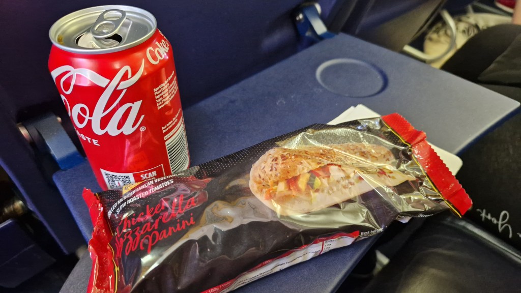 Following the Slovakian/Hungarian border for a while, 15 minutes into the flight we passed through 30,000feet and began to turn towards the north-east, to take us across Czechia, Germany and the Netherlands before crossing the North Sea. The inflight service began not long after take-off and I bought a meal deal of a chicken and mozzarella panini, a coke and Twix for €10.99. I’ve got to say that Ryanair really do their inflight catering well with plenty of choice and the food actually being tasty.