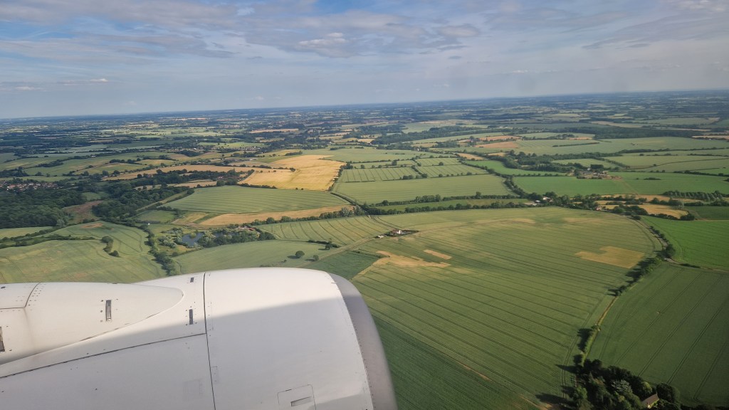 Part way through the flight the clouds began to break and the seat belt signs came on as we passed over the middle of Germany. I assume the pilots believed some turbulence was imminent, but we seemed to avoid it and the rest of the flight was pretty uneventful with us crossing over the English coast above the Suffolk Coasts and Heath AONB, with the Port of Felixstowe in view out of the window.