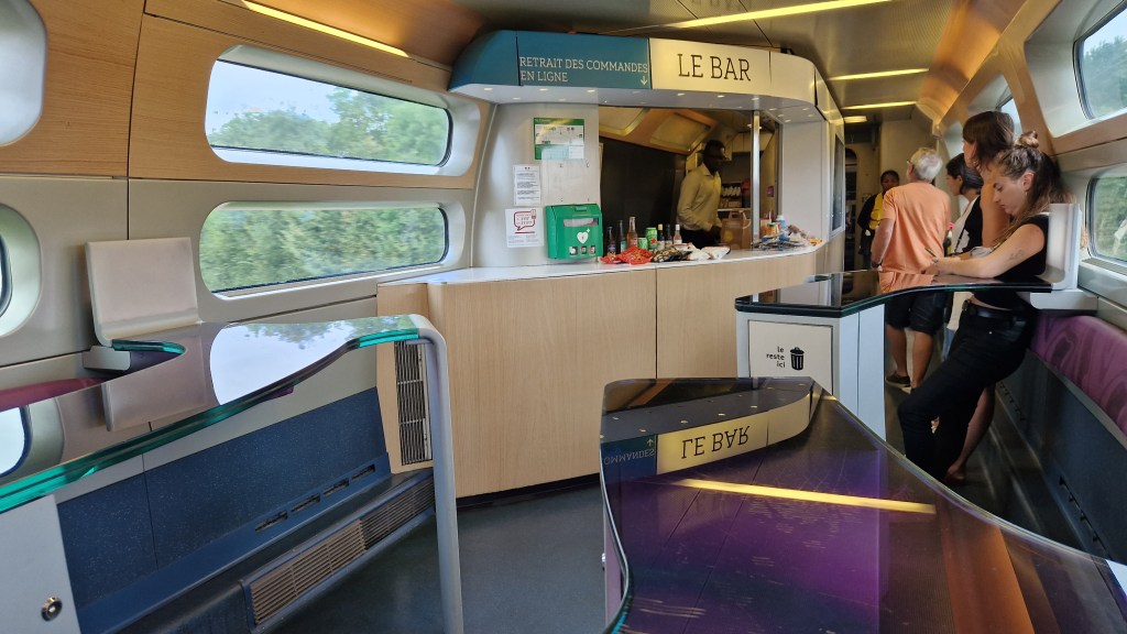 Heading up to the bar to collect our food, I was glad I had ordered for collection as the queue of people waiting to order was at least half a dozen people long. There was plenty of room to wait though as the café bars on the TGVs have an area for people to stand and socialise whilst having a bite to eat. When I got back to my seat and tucked in, I was pleasantly surprised at the taste and quality of what was essentially a microwaved burger. I suppose at the end of the day the French are known for their food!