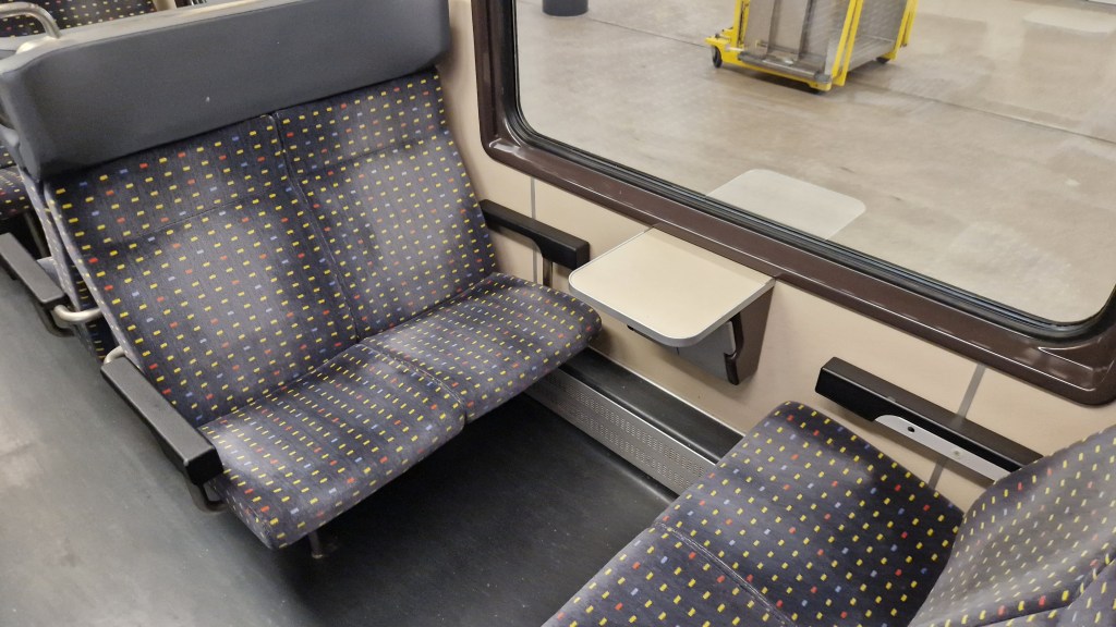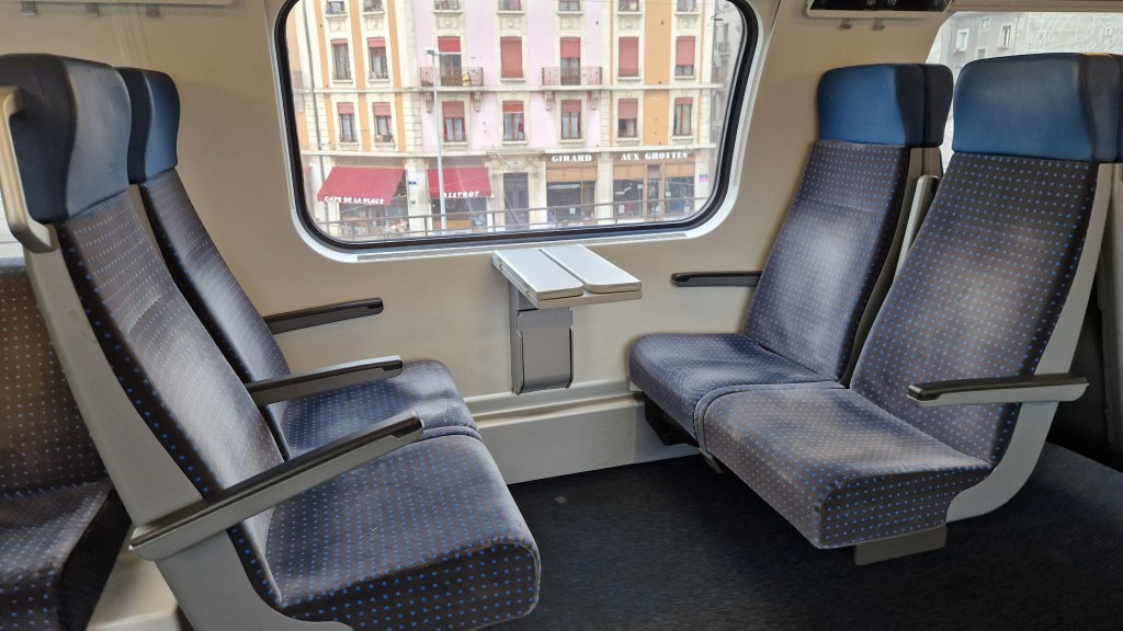 Formed of two double deck 8-car Bombardier SBB RAB(D)e 502 units, the service had a capacity of between 1,600 and 2,000 passengers and was scheduled to compete the journey in 42 minutes. In 2nd class the seating was mostly in bays of four seats around ½ tables, although there was some ‘airline’ style and longitudinal seating throughout the carriages. Whilst each pair of seats had access to a European socket, there was no USB sockets or WiFi provided.