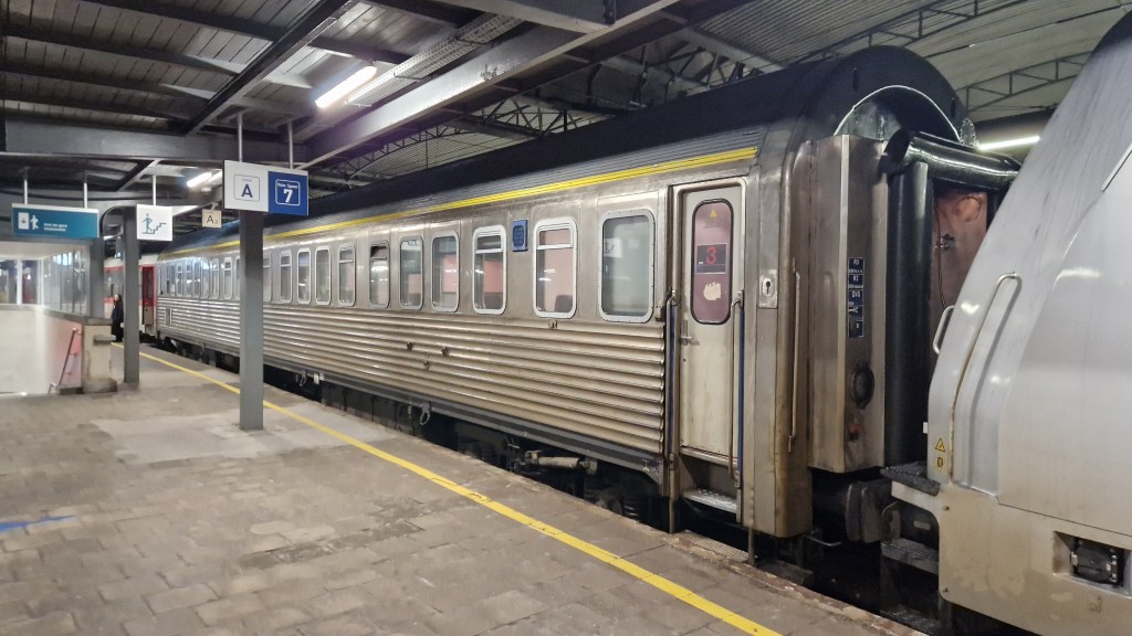 With around 15 minutes to go before departure I was on the correct platform, however had to spend a few minutes getting my bearings owing to the absurd formation of the train with coaches 2 and 4 at the rear, but coach 3 being at the front immediately behind the loco. After a quick stop to get a photo of our locomotive I boarded the sleeper carriage to find my room. European Sleeper operates a single sleeper carriage on this service (combined with some couchette and seater cars) and this certainly has a unique look, with American style fluted stainless steel outer walls. Originally constructed in the mid-1950s, the carriage was completely rebuilt in the 1990s to its current layout along with having received a more recent refurbishment.