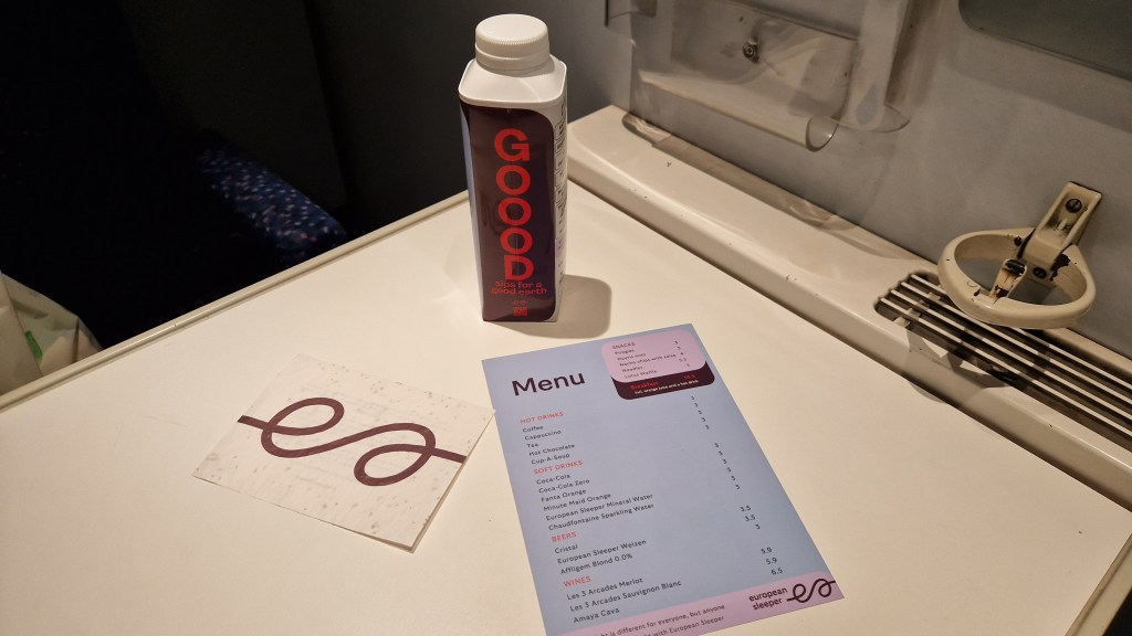 Settling into the room, I found a bottle of water along with a ‘plantable’ welcome card and a menu of snacks and drinks available for purchase. We departed one minute late and not long after the sleeper attendant came round to complete a ‘check-in’ process, offer a free drink from the menu (I went for the European Sleeper Weizen Beer) and confirm my choice of drink for breakfast (I of course went for coffee).