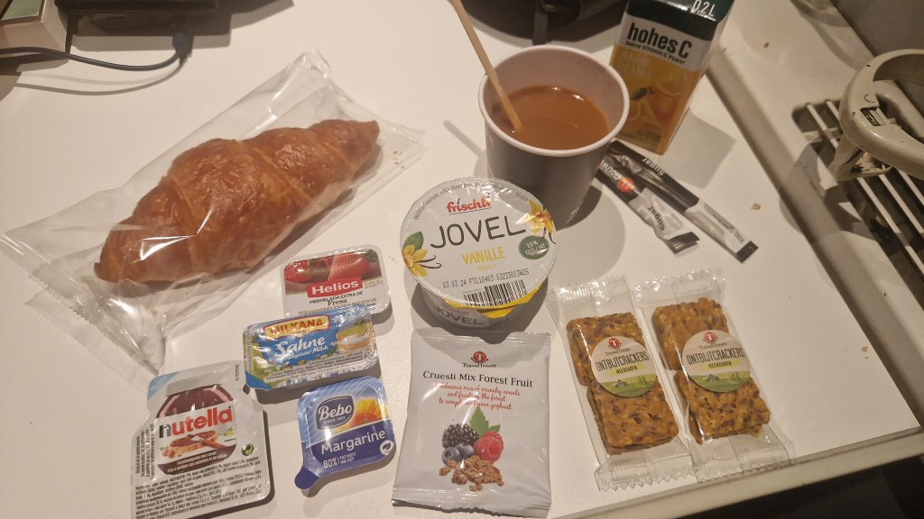 45 minutes before our scheduled arrival into Berlin Haupbahnhof the guard made a good morning announcement in English, French and German and not long after this breakfast was delivered to my room. This consisted of a croissant and a small ‘selection box’ of bits and pieces along with a cup of coffee, with the selection of food being pretty reasonable although the seed crackers were a bit odd.
