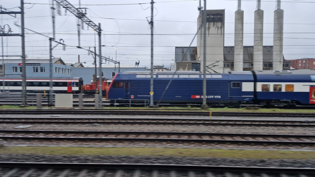 I woke up briefly at Baden-Baden and we were running only three minutes late, although I did notice that at some point in the night (possibly at Leipzig) we had changed direction which did confuse me for a moment. Drifting back off, I woke up again as we crossed the border into Switzerland, with Basel Bad station passing by the window. Basel SBB was our first stop in Switzerland, with 28 minutes scheduled at the station to allow the DB locomotive to be detached and an SBB locomotive to be attached.