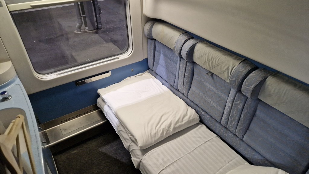 After the passport check had been completed, I decided to settle down for the night and await events from the hopeful comfort of the bed. The lower of the three bunks is essentially the compartment’s seats with a sheet added, a comfortable enough setting however the material of seat backs was a bit ‘scratchy’. The main issue I found (and its very much a 1st world problem) was that the sheet was too small to go under the mattress and so the slightest movement meant it came away. At one point in the night I woke up to find the sheet on the floor and me sleeping directly on the seat material. The other thing of note with the room, which others may find an issue, is that the blue ‘nightlight’ remained on throughout with no option to switch this off. I was able to sleep despite this, however I know some people have issues with lights and sleeping.