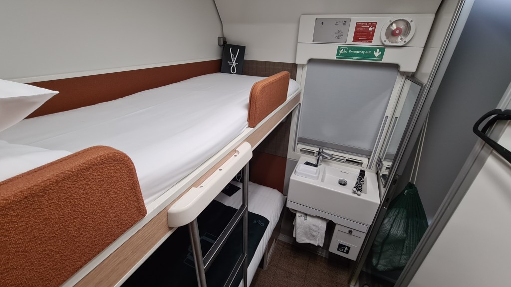 The final option is a proper sleeper compartment. At a minimum these provide actual mattresses, duvet and pillow whilst the room will also have a wash basin and towels provided. In the UK, sleeper rooms sleep up to 2, whilst on the continent they sleep up to 3, however you can pay a premium to have solo occupancy. Depending on the type of sleeper carriage, the compartments may have a fixed seat separately to the bed, or the lower bunk can be converted into seating for day use. There’s also the option on some routes to pay extra for an ensuite compartment which includes a shower and toilet.